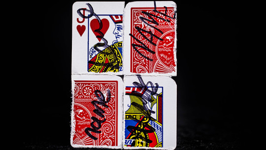 Ganz ohne Trickserei und ohne etwas in der Hand zu verstecken, wird eine Hofkarte in vier gleichgroße Teile zerrissen. Der Zuschauer mischt die Stücke und dreht sie um.