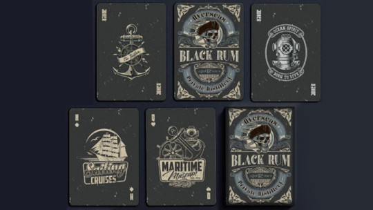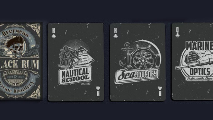 - Die Karten haben einen schwarzen Hintergrund mit aufwendigen Illustrationen im Vintage-Stil, darunter ein Piratenschädel auf der Schachtel und ein Anker mit einem Banner mit der Aufschrift „The Sailor“ auf der Kartenrückseite.