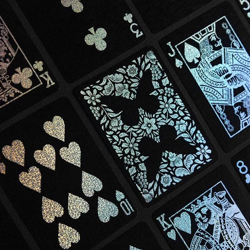 Dieses einzigartige Butterfly-Kartenspiel besticht durch sein komplett schwarzes Design mit schwarzem Rand. Vorder- und Rückseite sind farblos und stattdessen mit einer holografischen Folie überzogen!