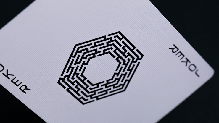Die Rückseite jeder Karte ziert Garcias „Labyrinth-Design“, ein markantes, geometrisches Muster, das gleichzeitig als cleveres und praktisches Markierungssystem dient. Es ist direkt in das Design integriert und erfordert keinerlei Entschlüsselung oder Kopfrechnen. Sobald Sie das Markierungssystem beherrschen, erkennen Sie sofort Farbe und Wert der Karte, ohne einen zweiten Blick darauf werfen zu müssen. Das System ist so konzipiert, dass es von der anderen Seite des Tisches aus sichtbar, für diejenigen, die es nicht kennen, aber unsichtbar ist. Sie müssen die Karten weder neigen noch die Augen zusammenkneifen oder sie nah an die Karten halten, um die Markierungen zu lesen.