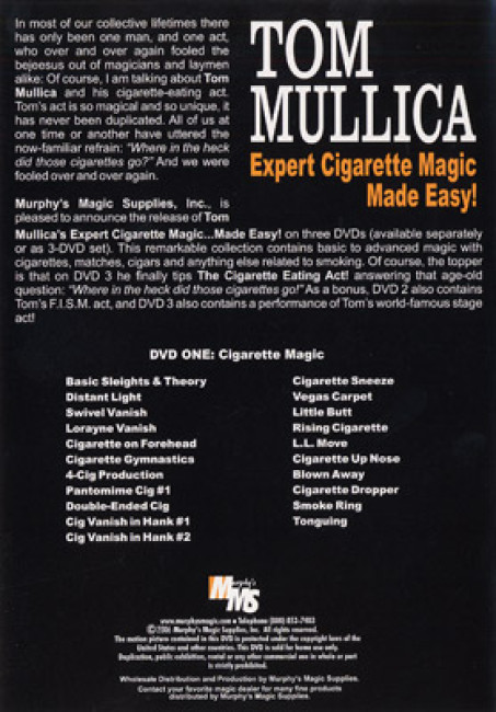 Tom Mullica's Expert Cigarette Magic...Made Easy bekannt zu geben! auf drei DVDs (separat oder als 3-DVD-Set erhältlich). Diese bemerkenswerte Sammlung enthält einfache bis fortgeschrittene Zauberei mit Zigaretten, Streichhölzern, Zigarren und allem anderen, was mit dem Rauchen zu tun hat. Der Höhepunkt ist natürlich das auf Vol. 3 Er gibt endlich Tipps