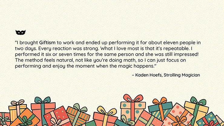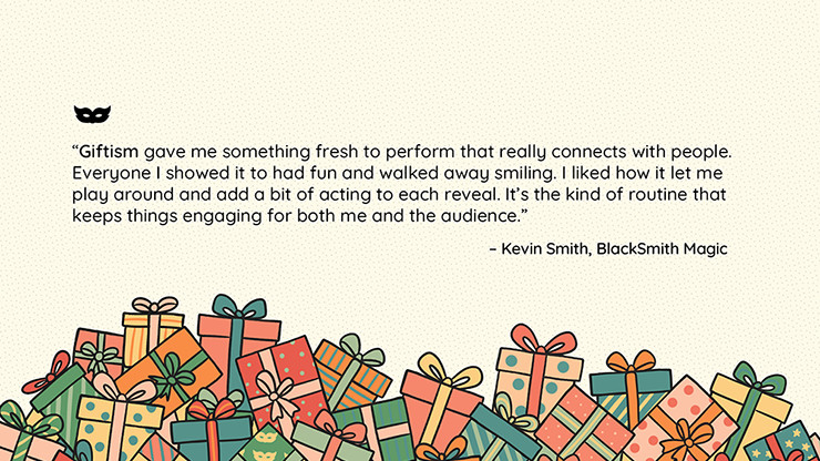 Chris Edwards, Zauberrezensent „Ich nutze Giftism seit ein paar Monaten in meinen Walking Acts und es macht mir riesigen Spaß, damit zu arbeiten. Es schafft sofort eine Verbindung, weckt ein warmes Gefühl der Nostalgie und ruft starke Reaktionen hervor. Die Methode basiert auf einem klassischen Mentalismusprinzip, aber die Präsentation mit dem schüttelnden Geschenk macht sie so nahbar, weil jeder schon einmal Geschenke gemacht oder bekommen hat. Diese gemeinsame Erfahrung zieht die Leute in ihren Bann.“