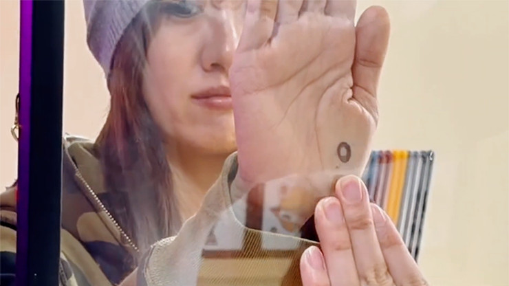 - Im nächsten Augenblick durchdringt die Markierung sichtbar das Glas...und erscheint auf der Hand des Zuschauers.