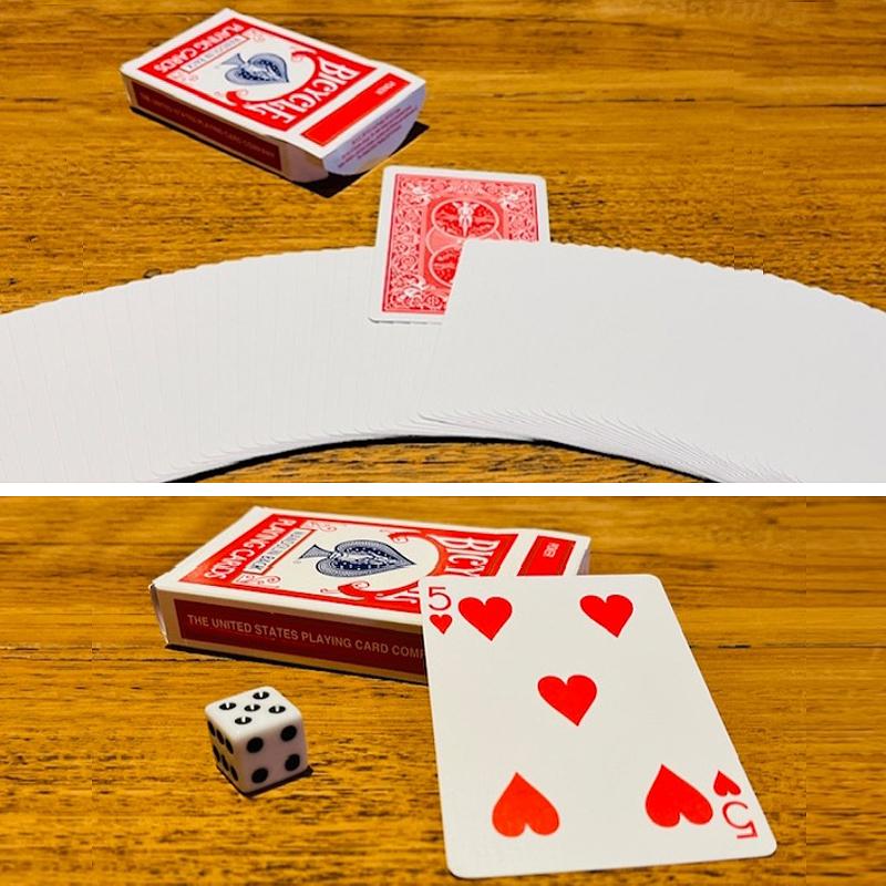 Lassen Sie einen Zuschauer würfeln (z. B. FÜNF) und dann eine Farbe (Herz, Karo usw.) wählen, in diesem Fall HERZ. Öffnen Sie dann die Kartenschachtel und nehmen Sie ein leeres Kartenspiel heraus. Gehen Sie die Karten durch, bis sich eine bedruckte Karte im Spiel befindet – und das ist die Herz Fünf! Der Rest der Karten ist wirklich leer.