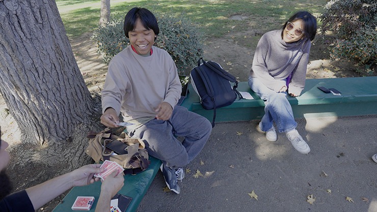 Auf der anderen Seite der Bühne oder am Tisch wird einem weiteren Zuschauer ein kleines Päckchen blauer Karten gezeigt. Er wählt einfach eine beliebige Karte. Kein Zwang, kein Herumirren. Die Wahl ist völlig frei, und die Karten bleiben stets in Sichtweite.