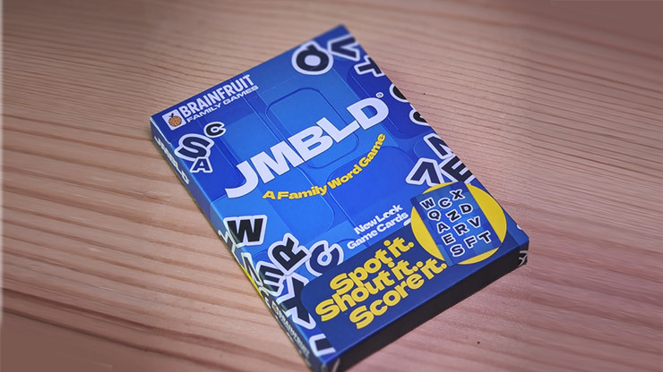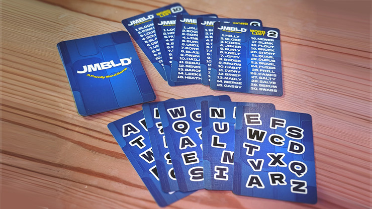 Ein Wortspiel, das sich absolut fair anfühlt Die Idee ist herrlich unaufdringlich. Man zeigt ein kleines Kartenset und erklärt, dass es sich um ein Wortspiel für die ganze Familie namens JMBLD (ausgesprochen „Jumbled“) handelt. Jede Karte zeigt einige durcheinandergewürfelte Buchstaben, aus denen sich verschiedene Wörter bilden lassen. Die Spieler sollen sich ein Zielwort aus einer Liste aussuchen und die Karten dann so anordnen, dass man sie erraten kann. Zuerst legt man die Karten offen hin – ganz einfach. Dann verdeckt – schon kniffliger. Und schließlich sollen die Spieler Karten ziehen, die die Buchstaben für das gesuchte Wort bewusst nicht enthalten, und man errät es – wie durch ein Wunder – jedes Mal richtig.