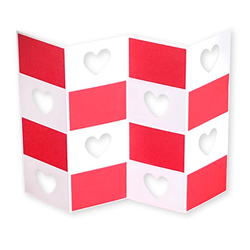 Der Zauberer nimmt ein kleines Kartenpaket aus dem Stapel und mischt es. Er verteilt die Karten auf zwei Stapel und bittet einen Zuschauer, ihn jederzeit zu unterbrechen. Die Karten oben auf den beiden Stapeln ergeben zwei Auswahlmöglichkeiten, eine für jeden Zuschauer. Eine ist die Herz Acht, die andere die Herz Dame, aber das weiß der Zauberer nicht. Jeder Zuschauer sieht sich seine Auswahl an und merkt sie sich. Der Künstler holt ein Stück Papier hervor, das mit roten und weißen Quadraten bemalt ist und überall Löcher in Herzform hat.